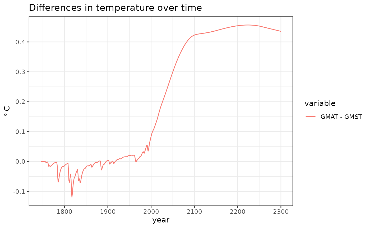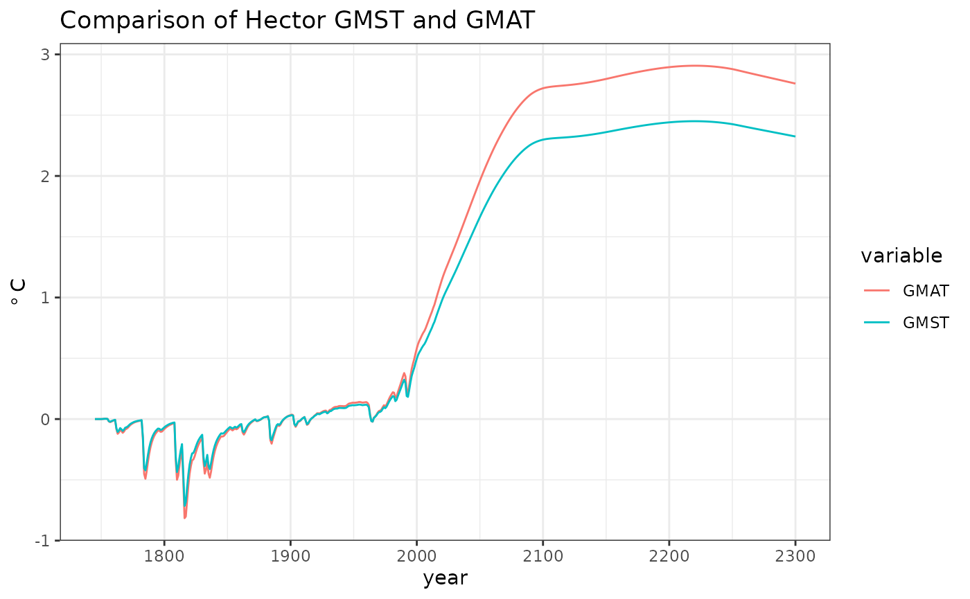 Both GMST and global mean air temperature (GMAT) are reported as Hector outputs. GMAT is the air temperature measured 2 meters above the ground and is what is presented in a daily weather report.2 This vignette demonstrates how to set up the calculate GMST and compares the two temperature results.