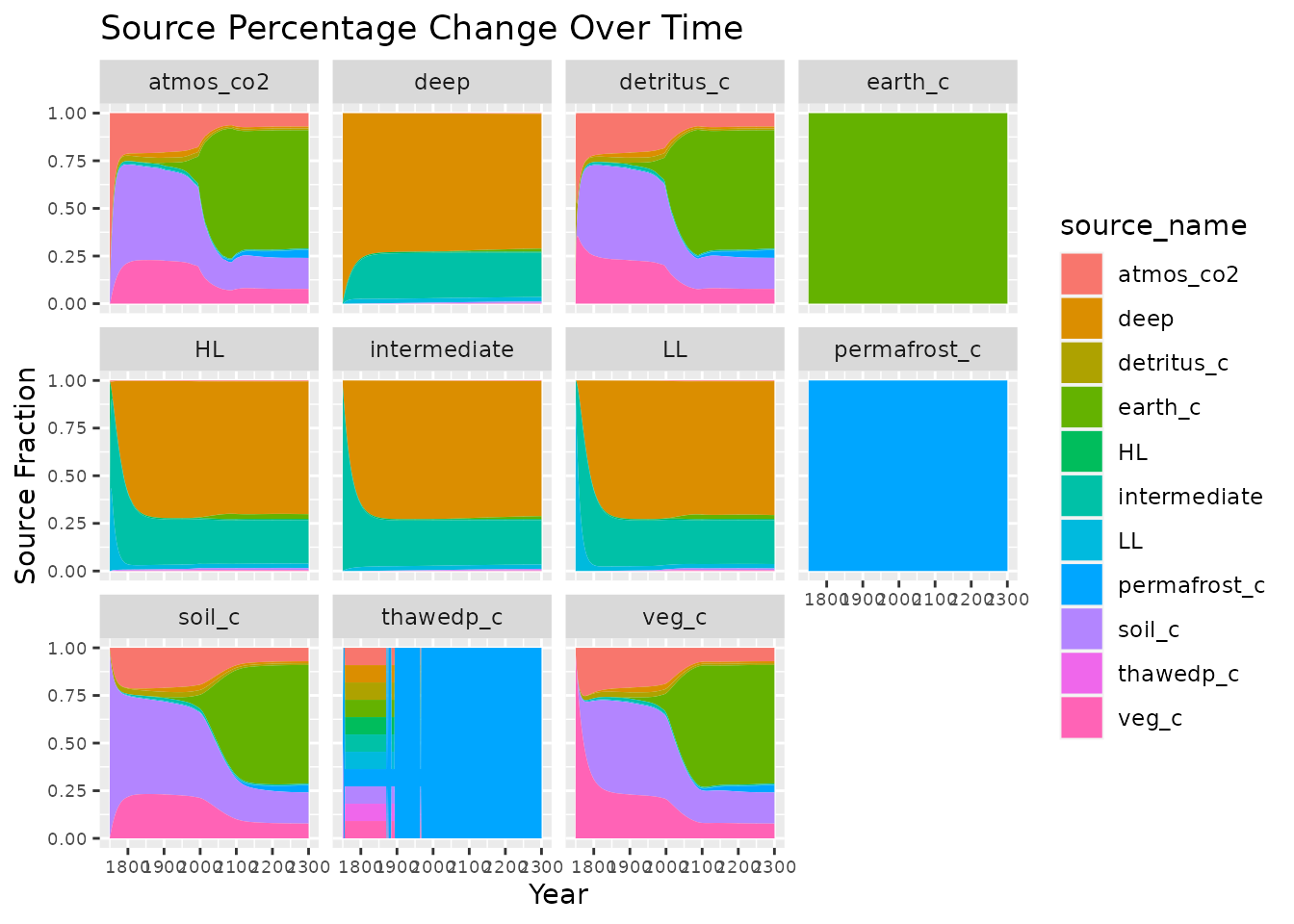 As the model moves forward in time from the start date, Hector tracks each pool’s fractional composition – i.e. the sources of its current carbon. When the run is finished, this data can be read into R and then analyzed.