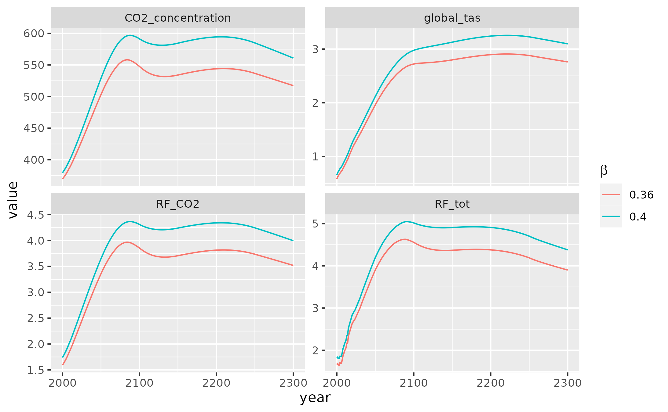 As we can see, the ability of CO\(_2\) fertilization to offset carbon emissions saturates, at high values of \(\beta\), the same increase in \(\beta\) translates into a smaller decrease in atmospheric CO\(_2\) and related climate effects.